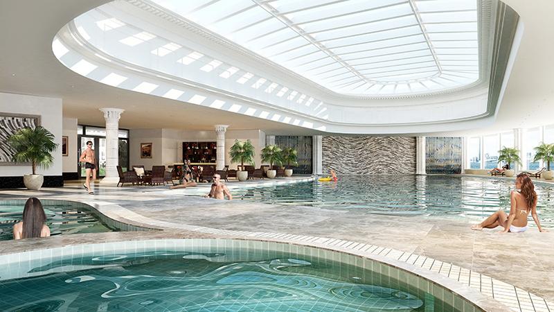- Bể bơi trong và ngoài trời rộng 350m